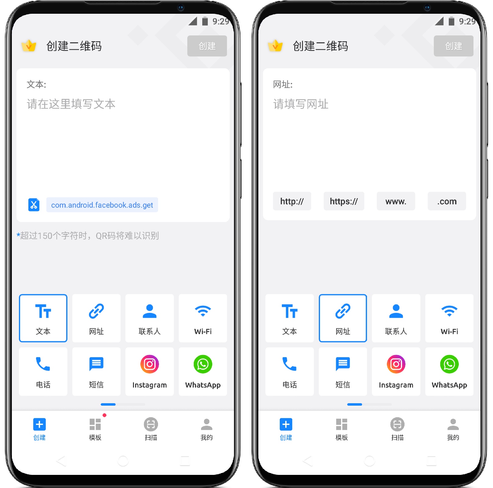 QR Code Creator支持将您的社交头像或公司徽标添加到QR码中以对其进行个性化设置。例如,您可以添加自己的图像以生成whatsapp QR码和Facebook QR码
